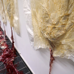2024, Sculpture sonore, Acier, papiers de riz, colle d'os de bovins, laine, pigments, micro piezo, amplificateur, pédale, deux prises électriques, 240 sur 98 cm